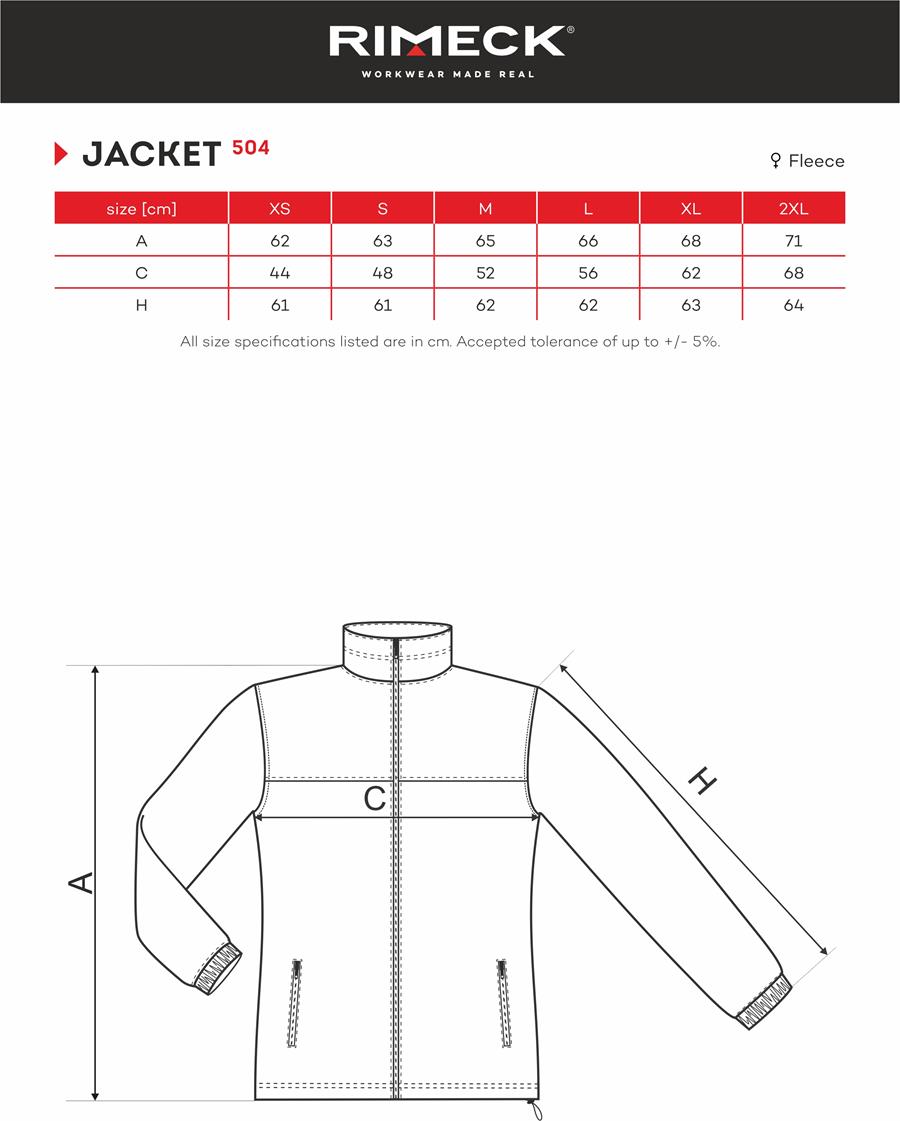 Polar damski Rimeck 504 (280 g/m²) to ciepły, izolujący polar z 100% poliestru z wykończeniem antypillingowym, dzięki czemu długo wygląda jak nowy. Lekko taliowany krój, zamek na całej długości, kieszenie na suwak oraz regulowany dół i elastyczne mankiety zapewniają wygodę na co dzień i do pracy. Idealny pod haft komputerowy.