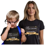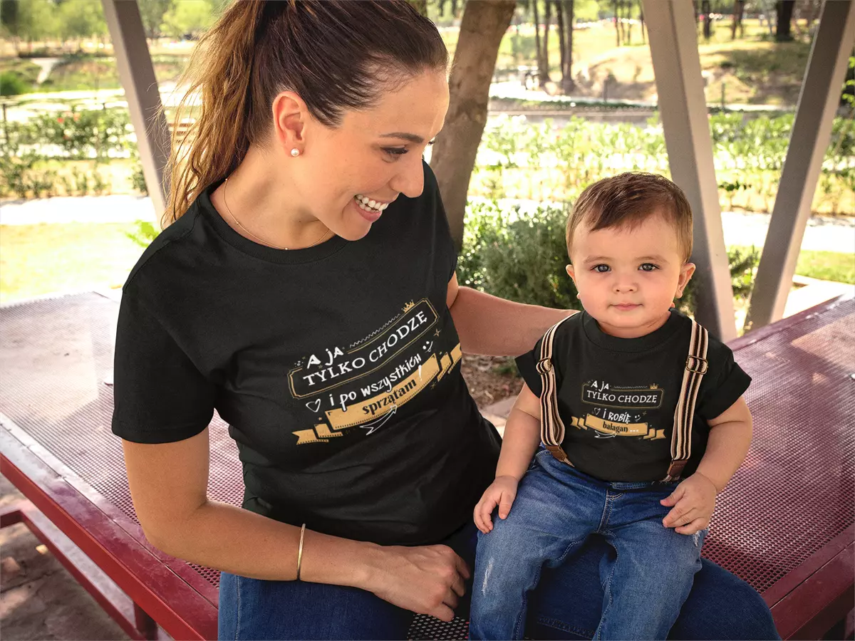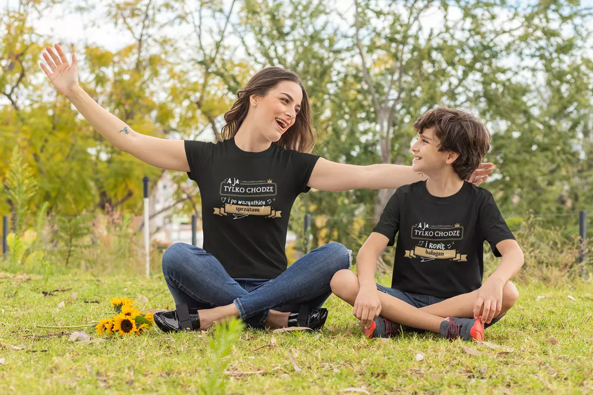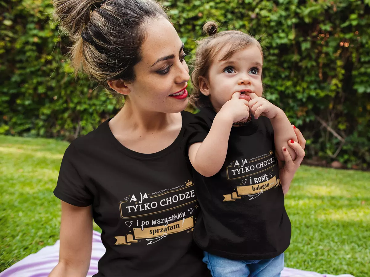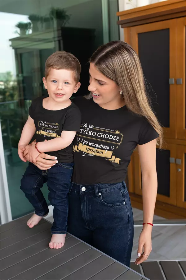 ZESTAW dla Mamy i Dziecka na Dzień Matki z napisem: "A ja tylko chodzę i po wszystkich sprzątam" ORAZ "A ja tylko chodzę i robię bałagan" kolor czarny